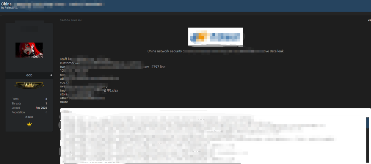 事件描述:2026.2.28某暗网数据交易平台有人宣称正在售卖一份中国网络安全公司*****技集团股份有限公司敏感数据,卖家称此份数据包含多类文件及记录,其中人员清单471条、顾客基础信息7250条、集团交易收支记录2797条、123.csv 文件2021条、扫描数据53个文件,另有攻防对象压缩包、VPS 信息、海外代理 IP、大客户名单、窃取数据、其他合同压缩包等,卖家称此份数据包括:所属公司、部门、工号、姓名、工资表部门编码、工资表部门全称、电话、出生日期、身份证号码、公司邮箱地址等核心信息。