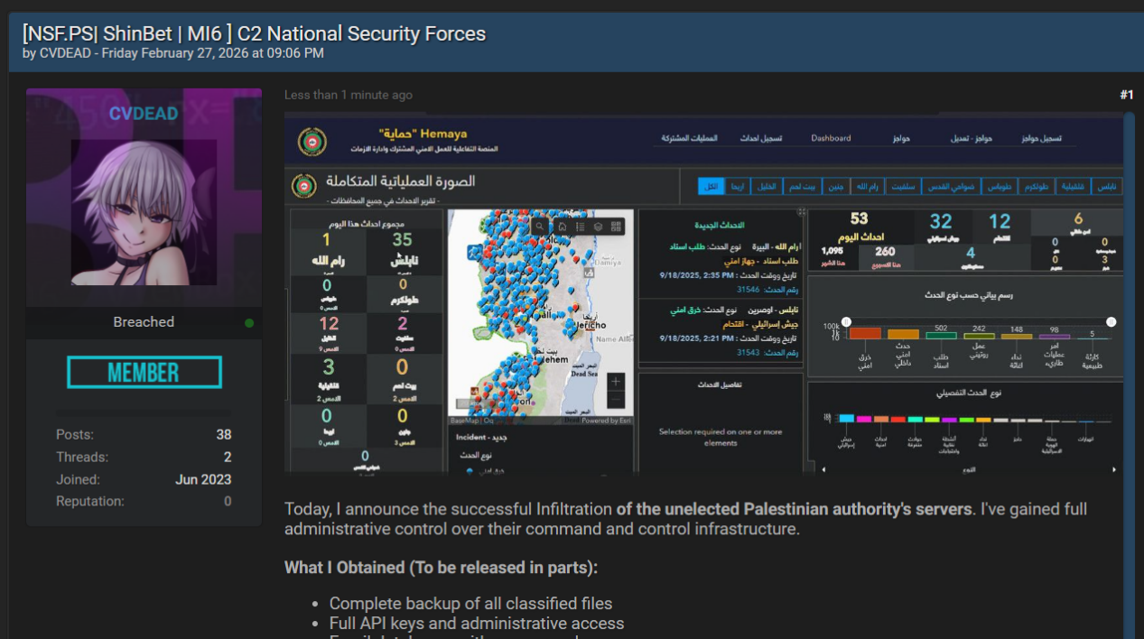 事件描述:2026.2.27某暗网数据交易平台有人宣称已成功渗透巴勒斯坦权力机构服务器,获取其指挥控制基础设施完整管理权限,卖家称将分批泄露数据,内容包括:全部机密文件备份、完整API密钥与管理权限、邮件通信数据库、SSL 证书、以色列辛贝特负责行动指挥官员联系方式、提供培训的MI6特工信息、安全行动详细记录、行政拘留人员完整名单、行政及工作人员账号等。