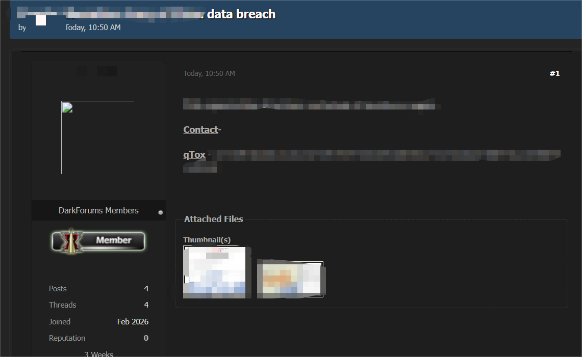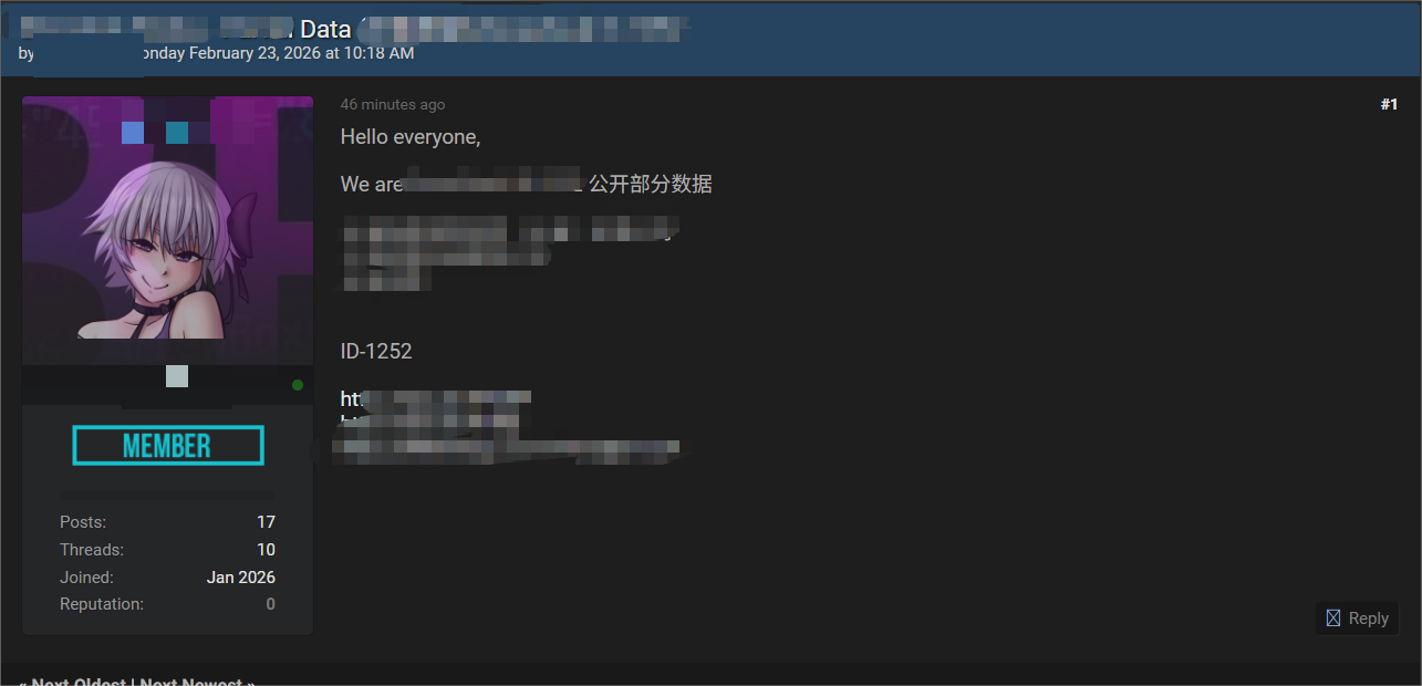 事件描述:2026.2.23某暗网数据交易平台有人宣称公开一份中国*****有限公司、中国*****有限公司ID-1252 相关数据,卖家称此份数据含两个压缩文件,大小分别为38.59MB、1.2GB,卖家称此份数据包括:ID-1252相关数据文件、LDCRM 备份文件。