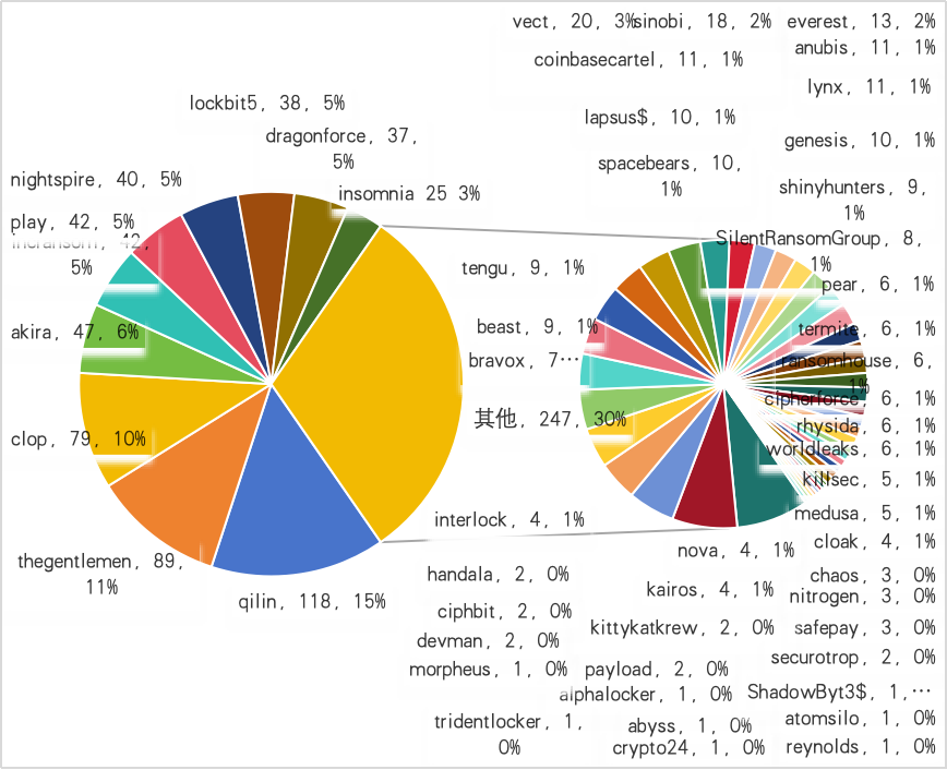 已经介绍过的黑客组织有:Lockbit3,Royal,Play,Rhysida,Alphv,8base,Hunters International、BianLian、Akira、Cactus、Abyss-Data、Black Suit、Arcus Media、space bear、killsec、fog、Funksec、Babuk-Bjorka、Hellcat、Babuk2、NightSpire、Dragonforce、Handala、D4RK4RMY、Warlock、World Leaks、sinobi 、Interlock、Qilin、Anubis如需了解请翻阅往期报告。