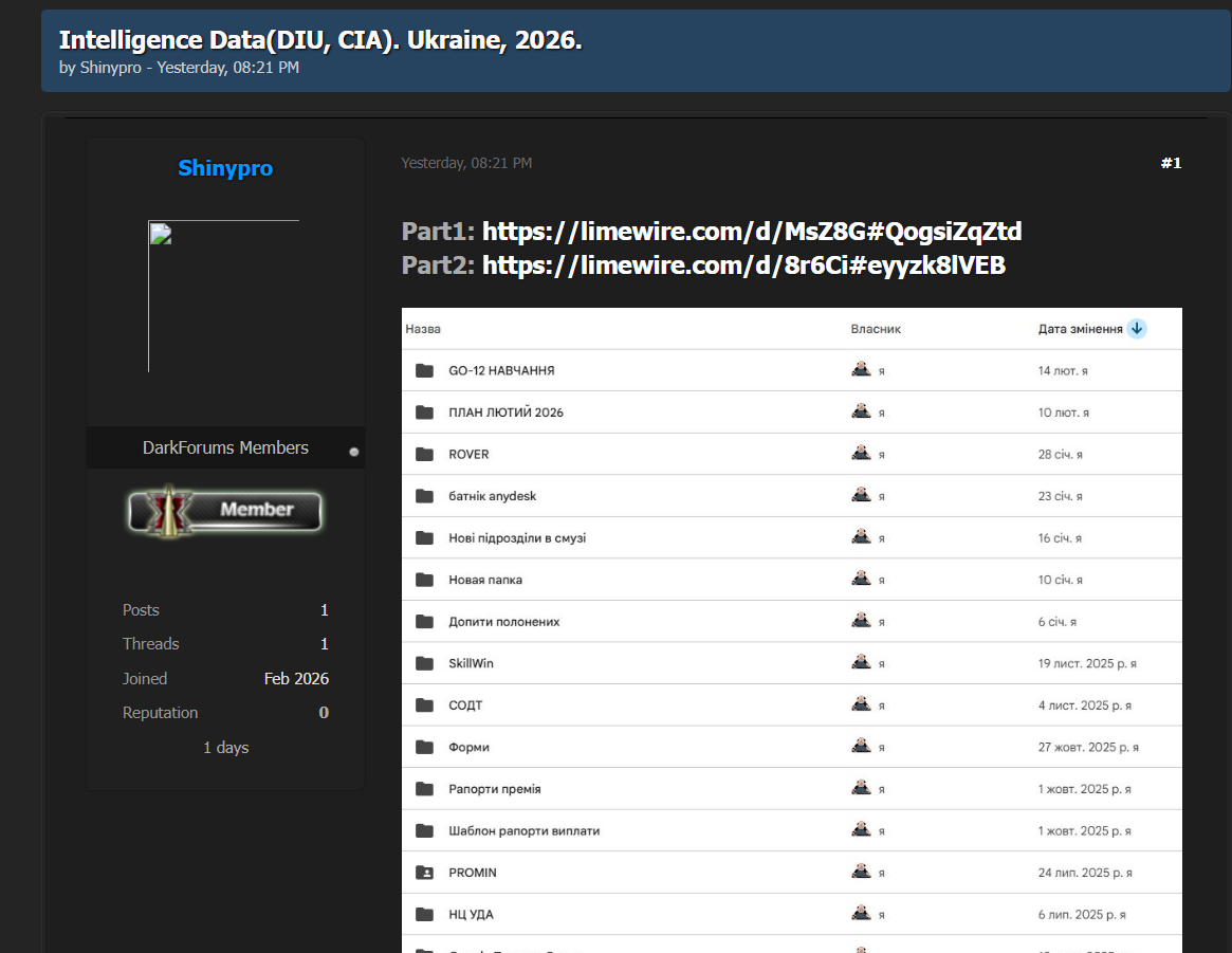事件描述:2026.2.23某暗网数据交易平台有人宣称正在售卖一份乌克兰国防部情报局(DIU)及美国中央情报局(CIA)相关情报数据,卖家称此份数据以两部分链接形式托管于外部平台,数据涵盖2025年10月至2026年2月的核心机密文件,卖家称此份数据包括:训练计划(GO-12)、2026 年作战计划、ROVER 系统资料、Anydesk 后门程序、接触区新部队编制、俘虏审讯记录、奖励与支付报告模板等核心数据。