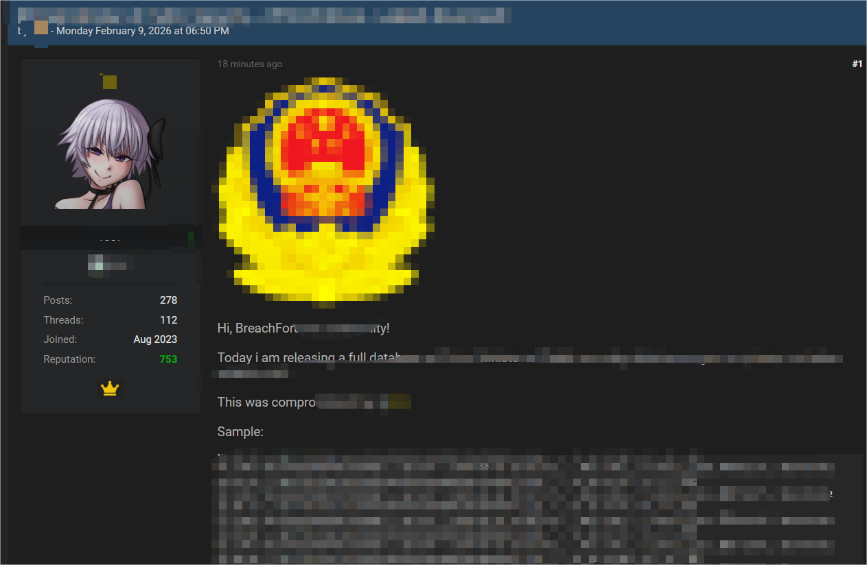 事件描述:2026.2.9某暗网数据交易平台有人宣称正在售卖一份中国公*****部车牌管理相关完整数据库,卖家称此份数据包括:车牌号码、图片上传信息、IP 地址、车辆颜色、相关编码、采集时间等车牌管理核心记录。