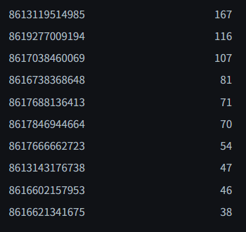 此外,检索到2月份使用匿名社交软件的活跃用户中,以“86(我国区号)”开头的手机号共发信息2,438条。使用匿名社交软件的用户,不会受到实名监管,其目的性值得考虑。以下为2月份使用“86”开头的手机号的TOP 10信息: