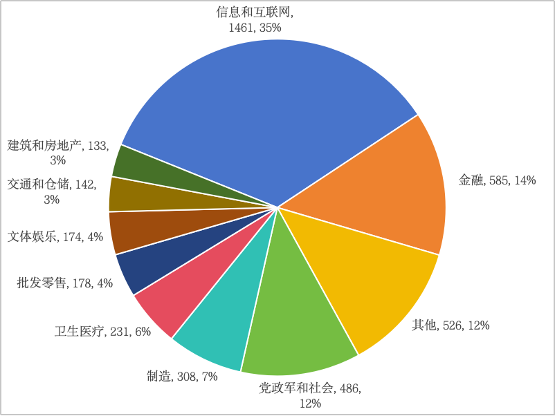 2月份行业属性数据占泄露数据总量约88%左右,泄露的行业数据主要包括信息和互联网行业、金融行业、党政军和社会、制造业、卫生医疗业等。12%左右的泄露数据无明显行业属性,包括邮箱密码二要素数据、无明显泄露源的公民个人信息数据、批量的企业工商数据等。详情如下图所示: