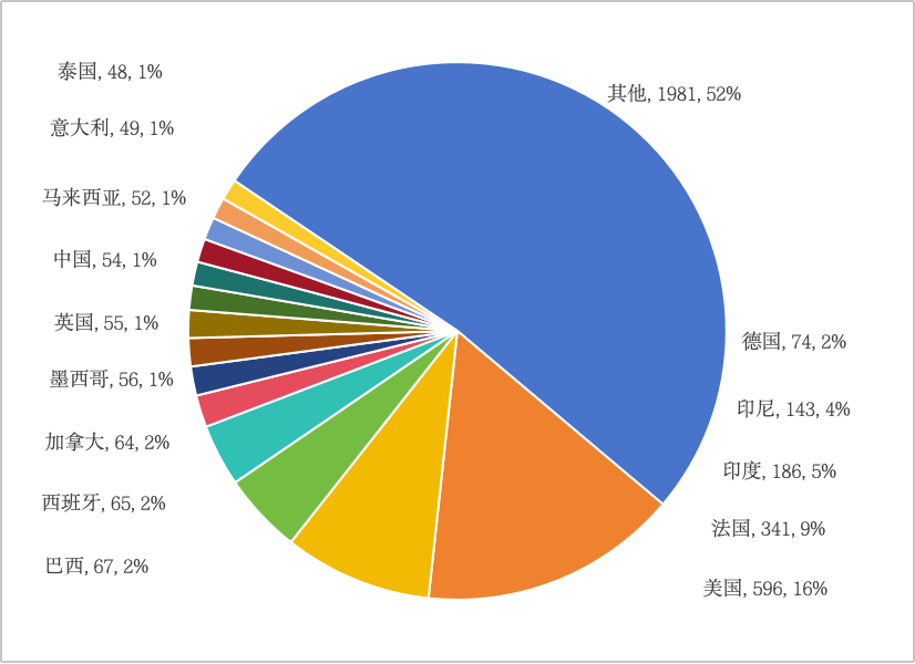 其中美国是数据泄露第一大国,共泄露数据596份,其他数据泄露较多的国家还包括法国、印度、印尼、德国、巴西、西班牙等。详情如下图所示: