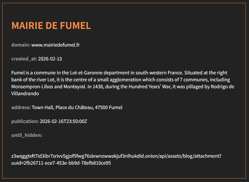 - 商业黑客组织 DragonForce 在2026/2/13公布了法国富梅尔市政厅(MAIRIE DE FUMEL)被勒索的信息。富梅尔市政厅是法国富梅尔市的地方行政机构,负责市政管理、公共服务、居民信息系统与政务运行,承担城市治理、公共服务、民生保障等核心职能。截止本篇报告发出之时,黑客组织 DragonForce 尚未发布更多关于法国富梅尔市政厅的数据。