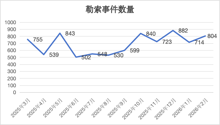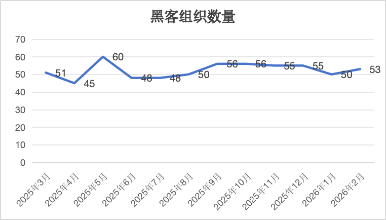 下图为近一年来黑客组织活跃度趋势图,从下图可看出,虽然每个月全球商业黑客组织的活动波动性较强(本月与上月相比有所减少),整体活跃度趋势正在逐步趋于稳定,统计末端(2026年2月)达到一年前统计前端(2025年3月)的106.5%: