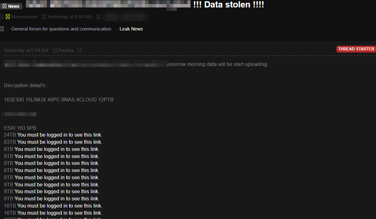 事件描述:2026.2.26某暗网数据交易平台有人宣称中国*****集团股份有限公司将于次日上午开始上传相关数据,卖家称此份数据涉及中国*****集团股份有限公司相关资产,涵盖163台 ESXI、15台LINUX、40台PC、8台NAS、4台云端服务器,数据总大小达12PTB,其中ESXI相关数据量为9PB,另有24TB、83TB、多份9TB、两份16TB 等不同量级的相关数据。