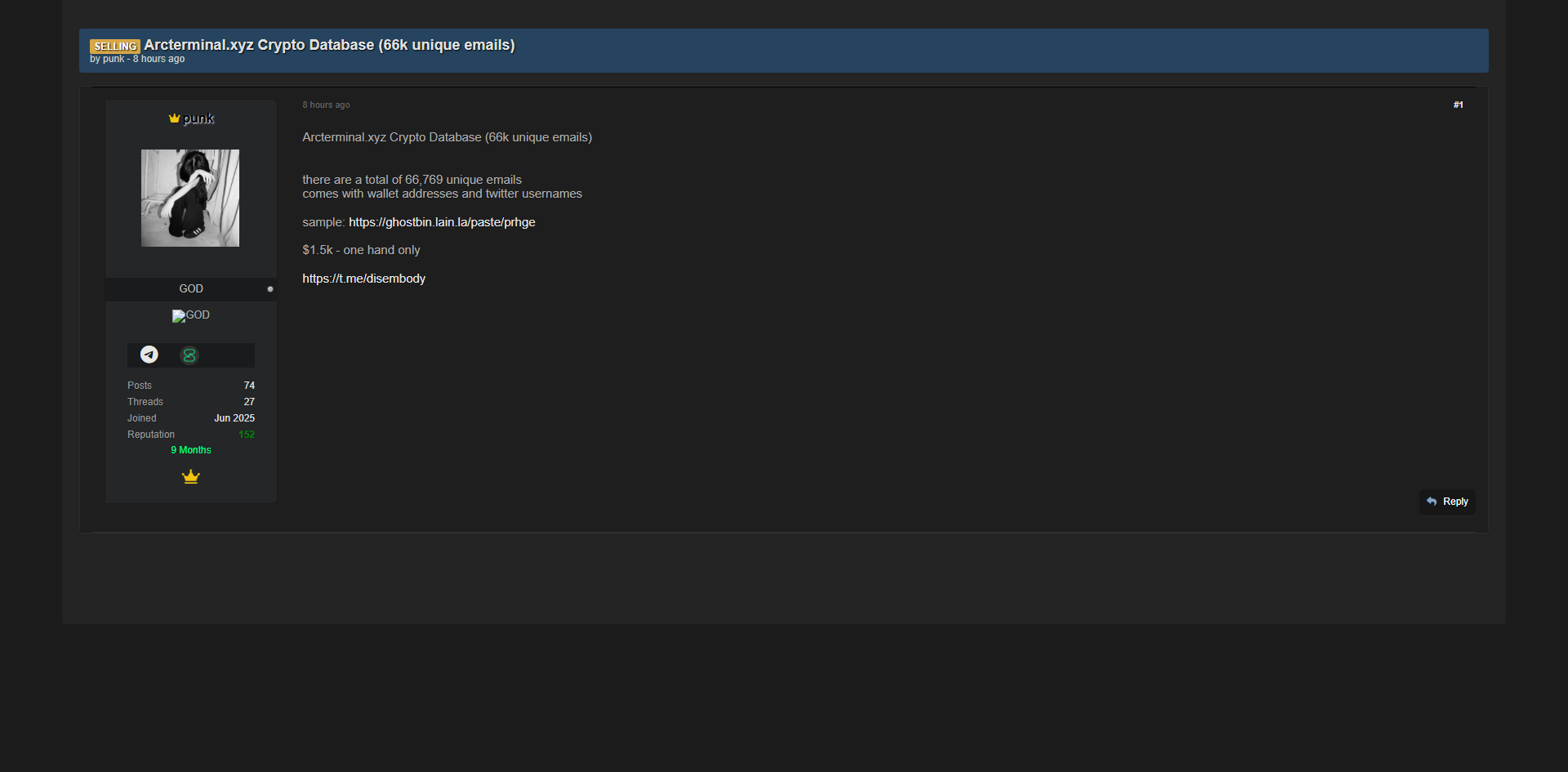 威胁行为者据称在黑客论坛上出售Arcterminal.xyz加密货币数据库,共66,769条唯一邮箱记录,包含钱包地址和Twitter用户名。