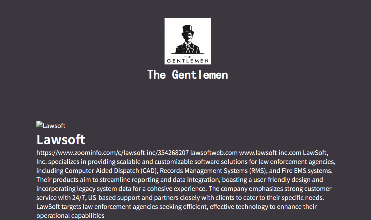 这份勒索软件声明称,绅士(Thegentlemen)团伙将洛索夫特公司(LawSoft, Inc.)列为攻击目标,该企业为执法机构提供计算机辅助调度、案件记录管理及消防 / 紧急医疗服务类软件,团伙还扬言,若未收到赎金,将对该企业的运营实施破坏或窃取其数据。声明中还特意提及洛索夫特公司的软件具备可拓展、可定制的特性,且该企业提供美国本土 7×24 小时技术支持,言下之意此类核心服务或因本次攻击受到影响。