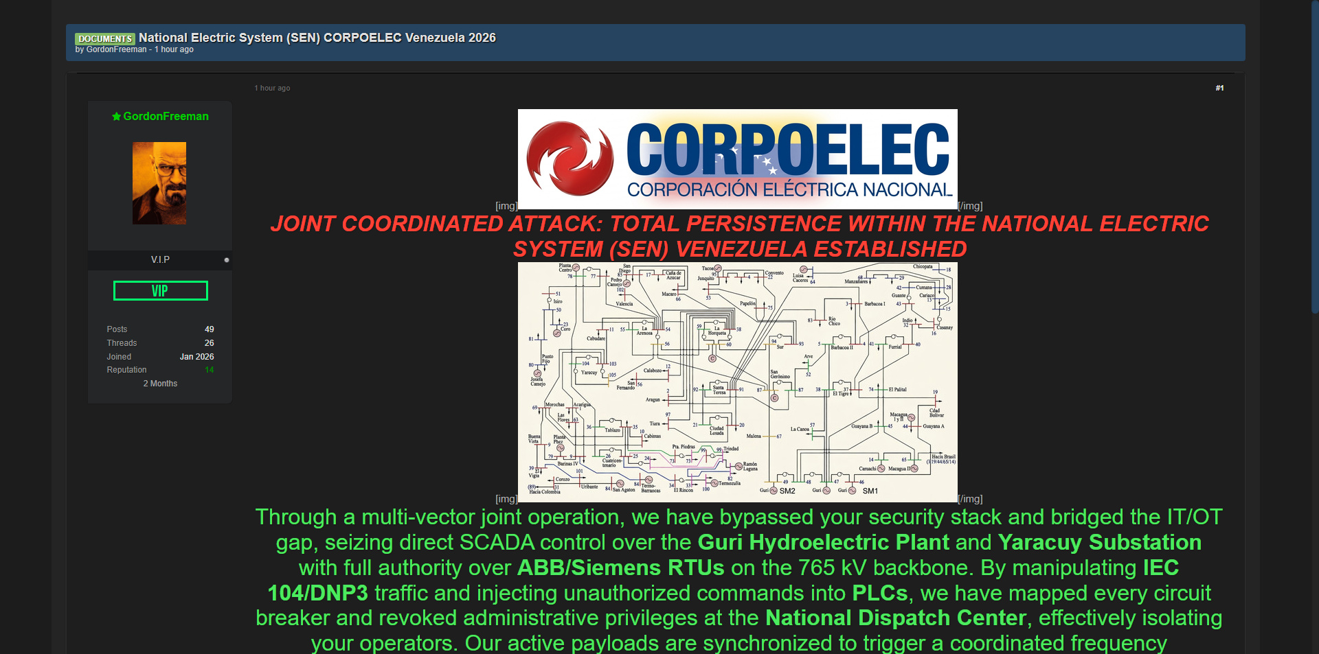 黑客组织宣称对委内瑞拉国家电力公司CORPOELEC及国家电力系统(SEN)实施多向量联合协调攻击,已成功在系统中建立完全持久化控制,掌握关键水电站和变电站的SCADA系统。