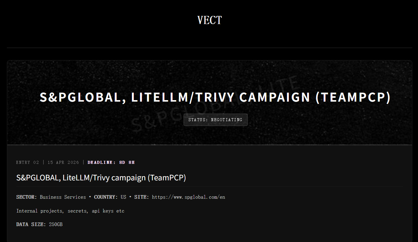 黑客团伙VECT针对美国标普全球(S&P Global)发起LITELLM/TRIVY CAMPAIGN,成功窃取该公司250GB内部机密数据,包含大量内部项目文件、核心机密信息、API密钥等敏感内容,目前处于谈判阶段。