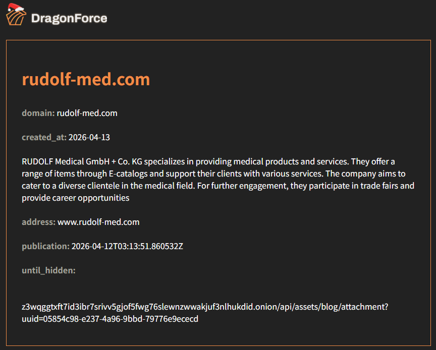 黑客论坛DragonForce曝光德国医疗公司rudolf-med.com完整数据记录,该公司全称RUDOLF Medical GmbH + Co. KG,专注于提供各类医疗产品与服务,通过电子目录支持客户,并参与医疗领域贸易展及职业发展项目。
