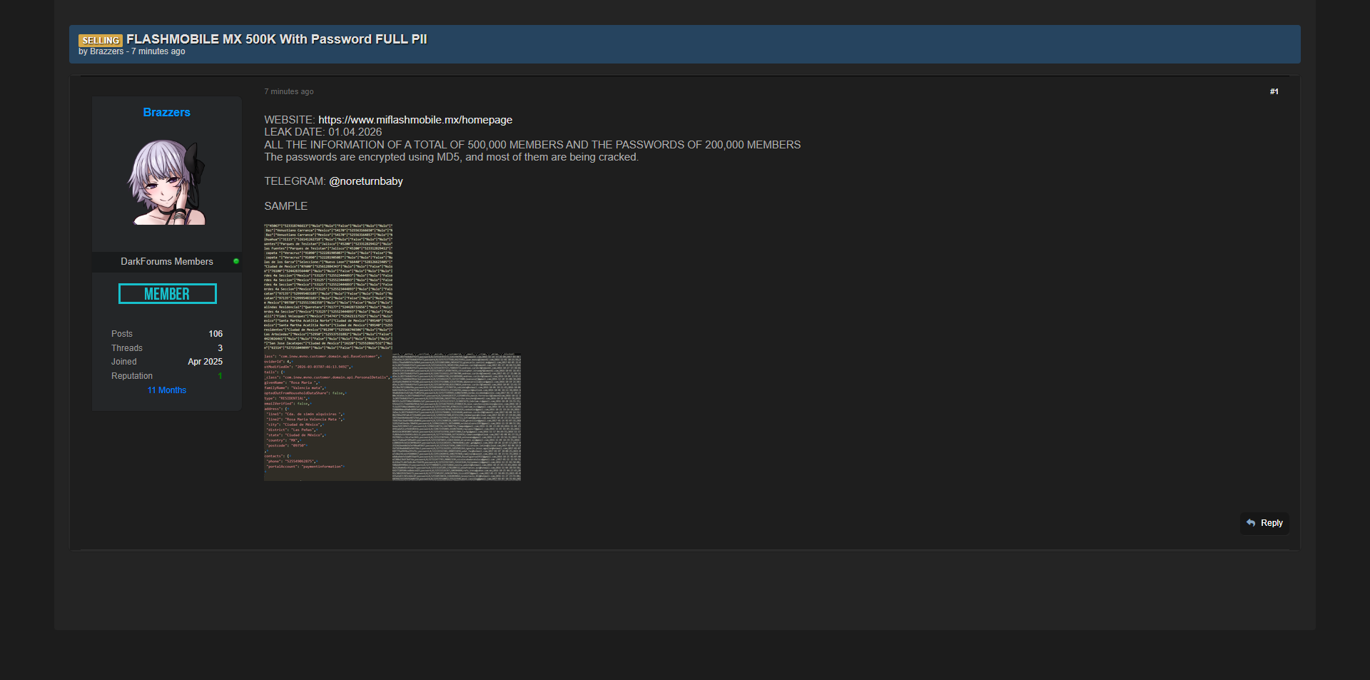 零零信安暗网新闻 | 墨西哥FlashMobile MX 50万用户完整PII及20万密码泄露