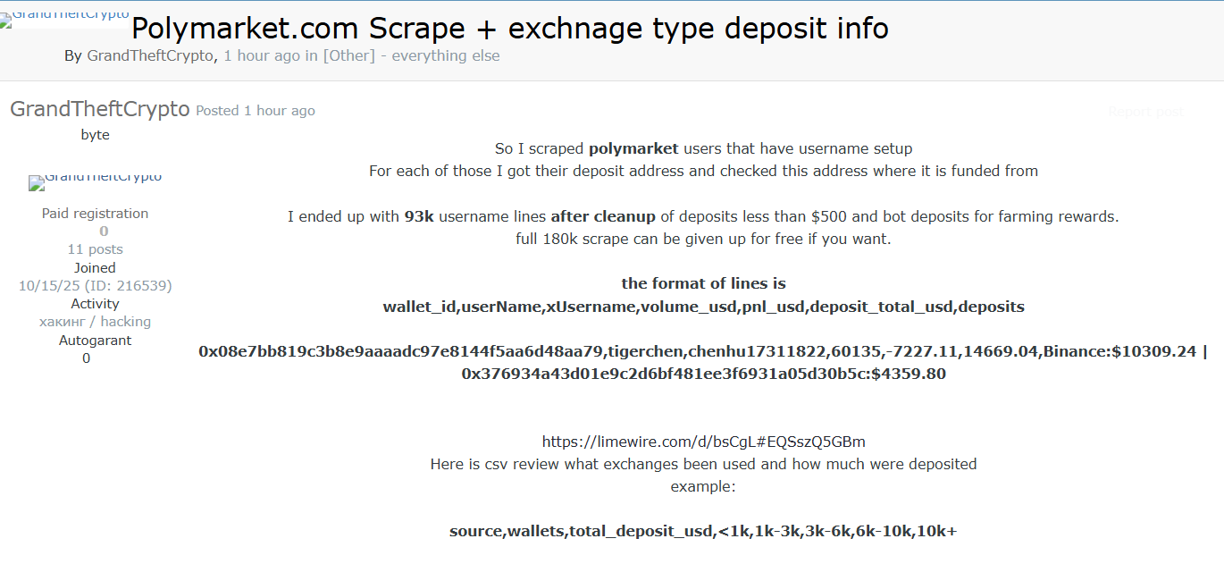 威胁行为者公开宣称,正售卖通过爬取手段获取的Polymarket平台用户数据,此次泄露数据分为两部分,包括9.3万条用户名称相关记录(含多类敏感交易及身份关联信息),以及完整的18万条爬取数据集,且该数据集仅向单一买家出售,定价4999美元。Polymarket作为全球知名的去中心化预测市场平台,核心功能允许用户对各类事件结果下注,月度活跃用户曾从1.3万激增至22万,其用户数据承载大量交易流水、资金来源等敏感信息,此次通过爬取手段获取并售卖用户数据,属于针对性较强的黑产牟利型数据泄露事件,对平台用户资金安全、个人隐私及平台声誉构成严重威胁。