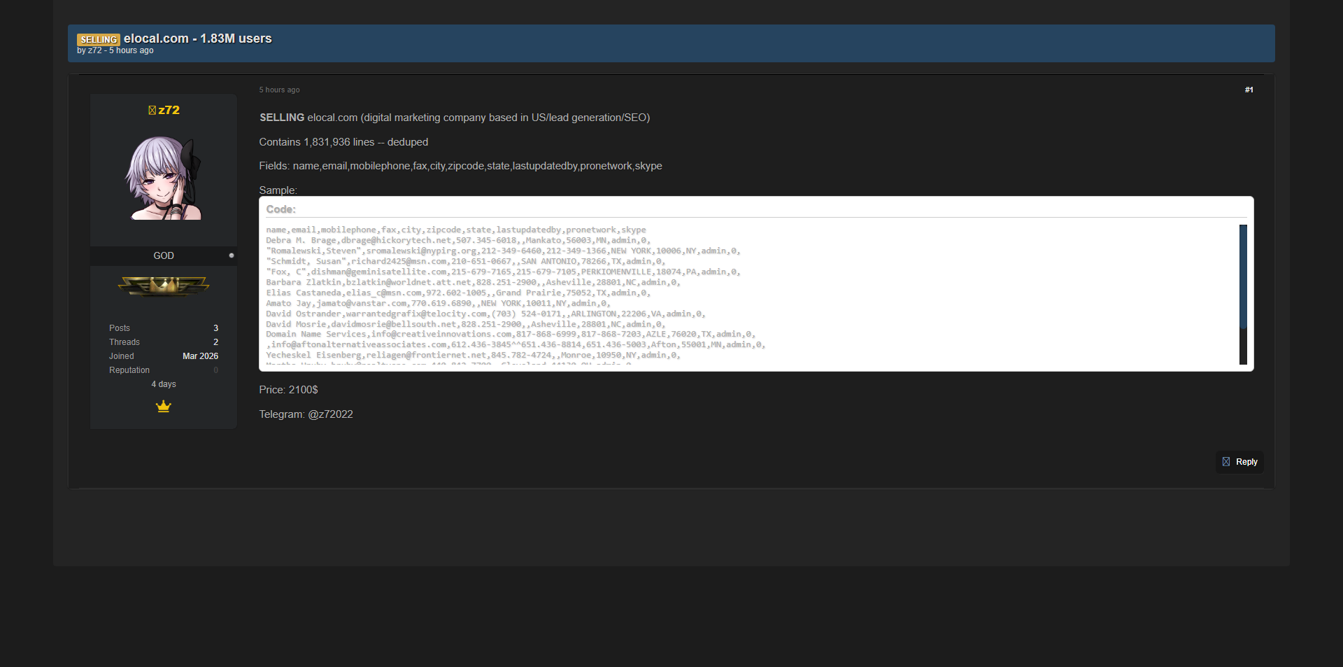 威胁行为者据称在黑客论坛上出售美国数字营销公司elocal.com(lead generation/SEO业务)的183万用户数据库,包含1,831,936条去重记录。这些数据涉及大量美国用户个人信息。