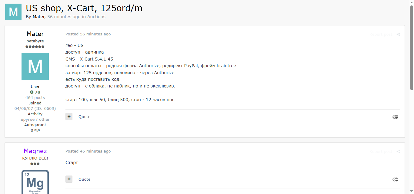 黑客论坛拍卖一家美国X-Cart 5.4.1.45电商店铺的管理员后台权限,包含完整后台控制、Authorize.net原生支付表单、PayPal跳转支付、Braintree免费支付通道以及每月125单订单运营数据。