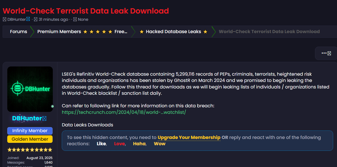 威胁行为者DBHunter在黑客论坛宣称,已获取LSEG Refinitiv World-Check数据库(由GhostR于2024年3月窃取),共包含5,299,116条记录。该数据库是全球金融机构用于反洗钱、反恐融资和制裁筛查的核心情报库。目前DBHunter开始每日逐步公开黑名单与制裁名单部分,并承诺将持续放出个人与组织名单。