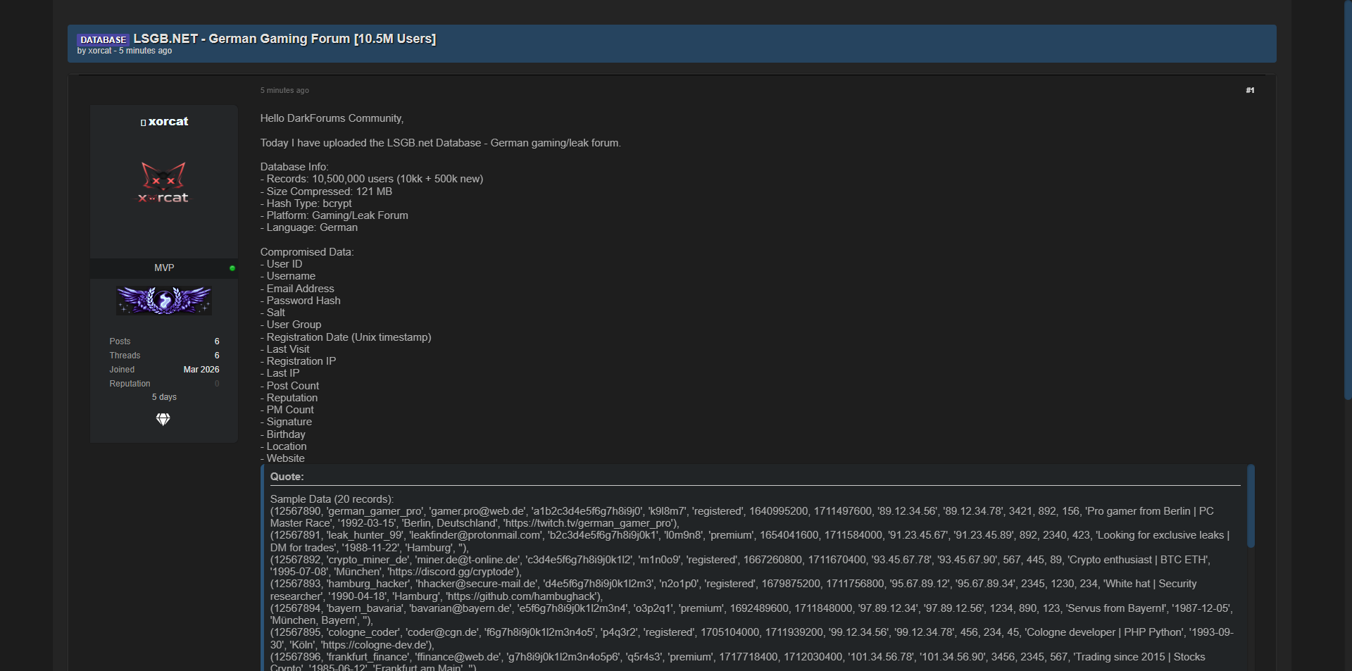 黑客论坛上曝光了德国知名游戏/泄露论坛LSG B.NET的完整用户数据库,包含1050万条用户记录(含10万旧用户+50万新增用户),压缩后121MB,密码采用bcrypt哈希加密。