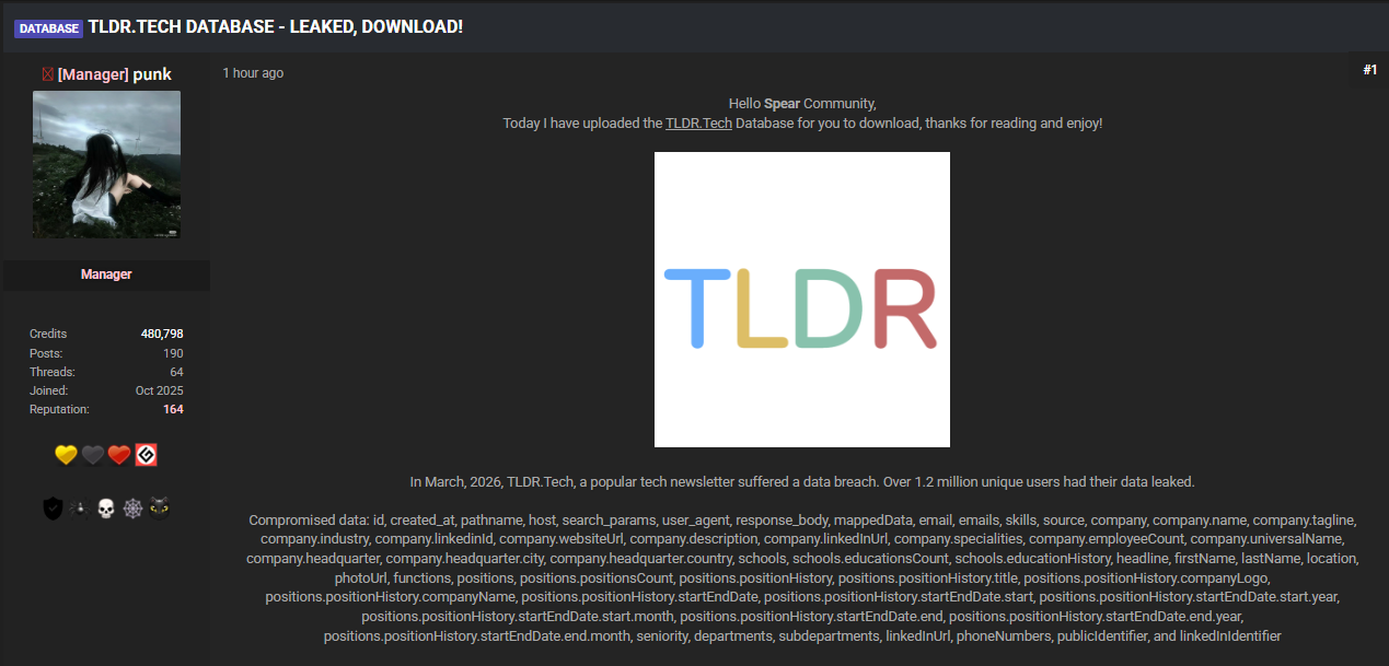 TLDR.Tech 发生数据泄露,大量用户信息已在黑客论坛曝光。