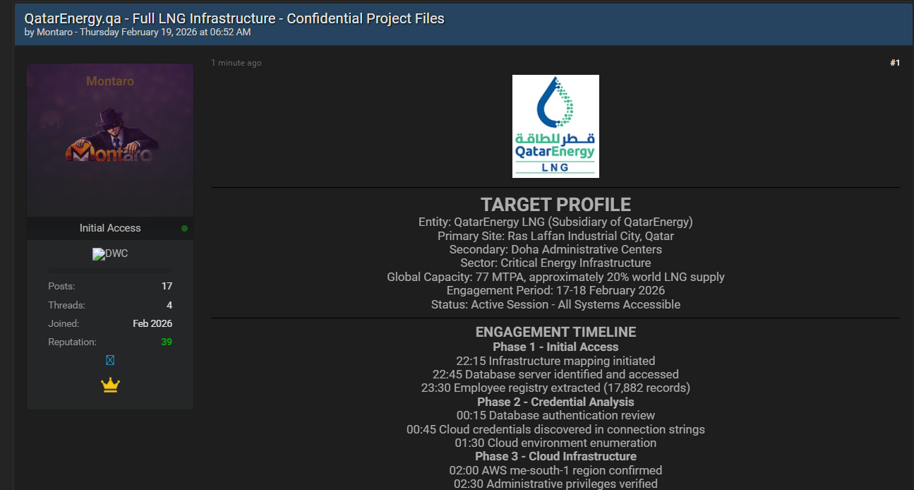 一名未公开身份的威胁行为者宣称,已入侵卡塔尔能源公司(QatarEnergy)旗下子公司——卡塔尔能源液化天然气公司(QatarEnergy LNG)。该公司总部位于拉斯拉凡工业城(Ras Laffan Industrial City),承担着全球约20%的液化天然气(LNG)供应,是全球能源供应链的核心节点。此次被宣称的入侵事件发生于2026年2月17日至18日,威胁行为者声称获取了海量人员记录、多云数据及物理安全系统访问权限,涉及各类高等级账户权限,对该公司运营安全、全球LNG供应链稳定及员工隐私构成致命威胁。
