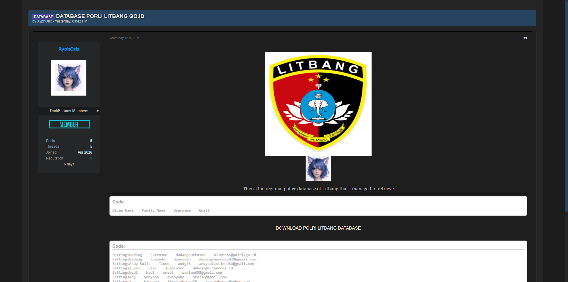 黑客论坛曝光印度尼西亚国家警察(Polri)Litbang(研究与发展局)内部人员数据库,包含该部门工作人员的核心账户信息。