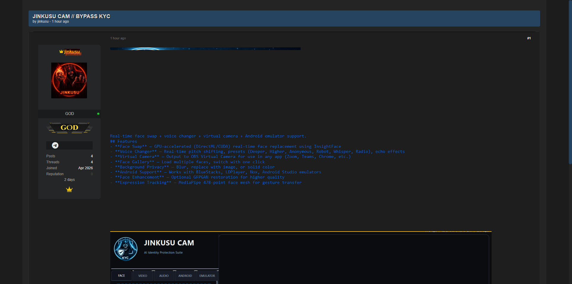 黑客论坛上出售Jinkusu Cam高级KYC绕过工具,包含实时人脸交换、语音变声、虚拟摄像头、Android模拟器支持、背景隐私保护、面部增强及表情跟踪等高级AI身份伪装功能。