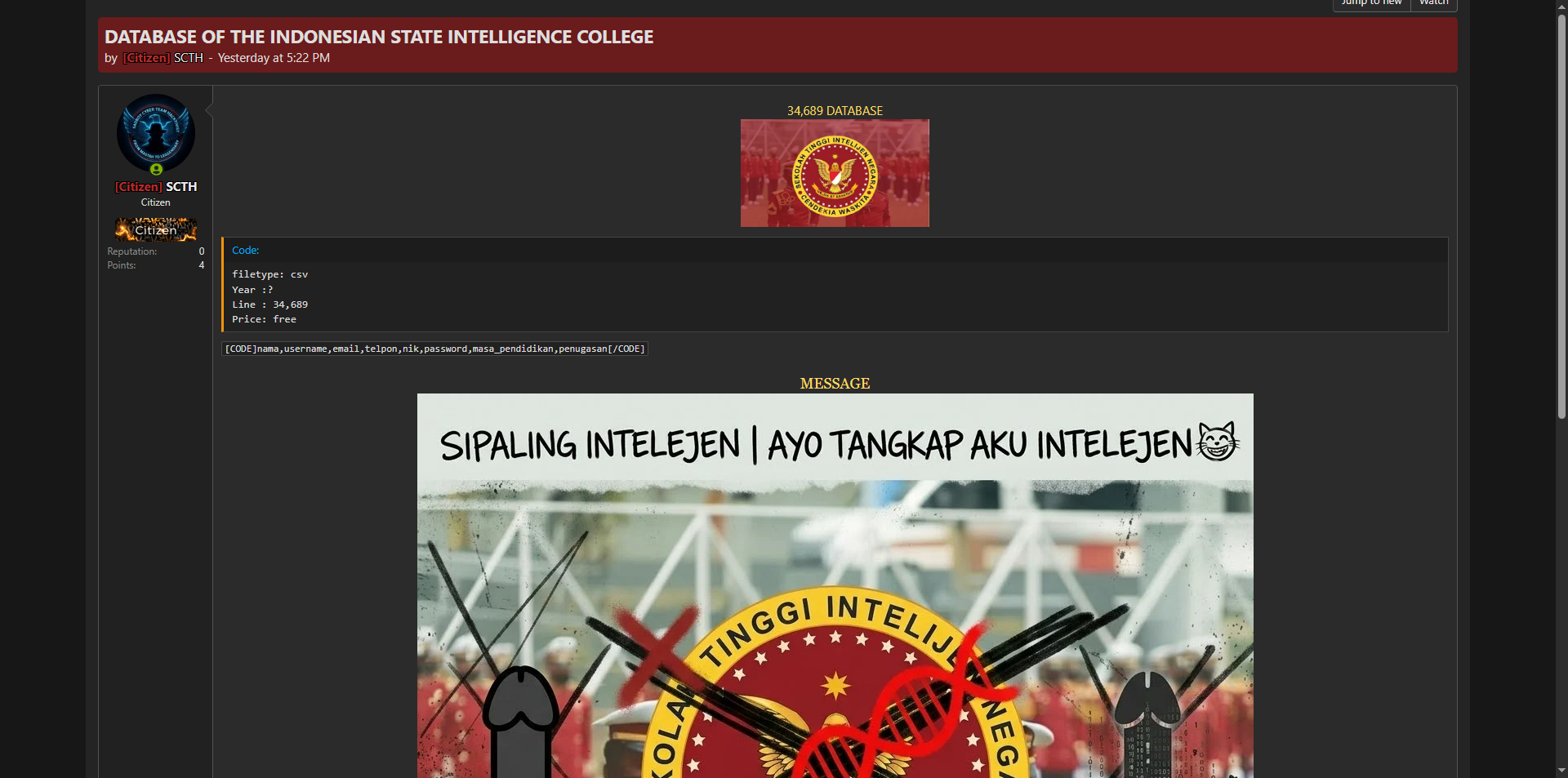 零零信安暗网新闻 | 印尼国家情报学院34,689条学员及人员数据库泄露