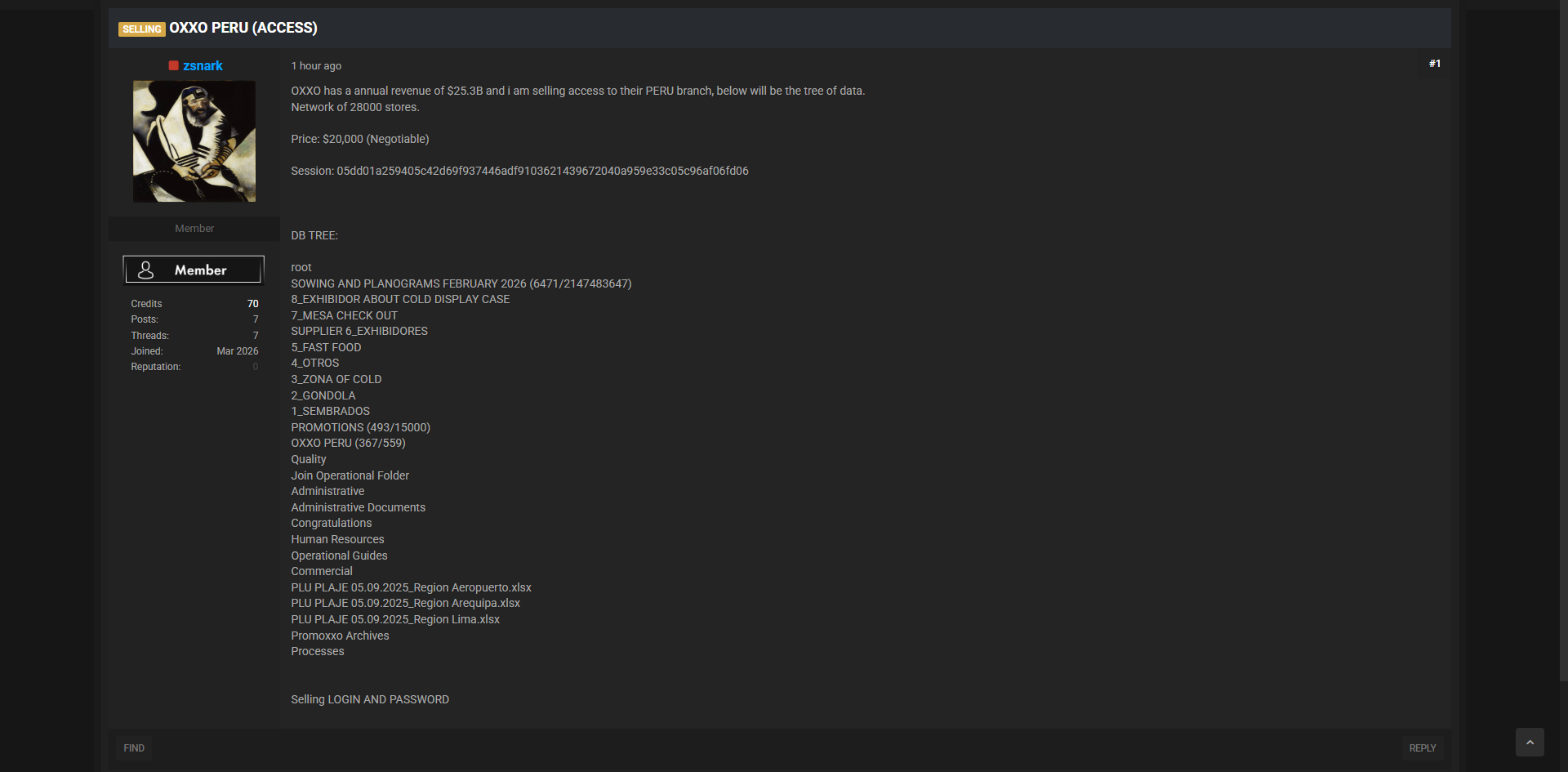 威胁行为者在黑客论坛上出售秘鲁OXXO便利店的内部数据库访问权限,包含2026年2月播种与货架陈列计划、促销活动、OXXO秘鲁、行政文件、人力资源、操作指南、商业资料以及多个区域PLU PLAJE Excel文件等核心业务目录。