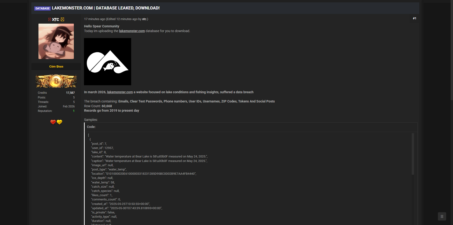 黑客论坛上曝光了美国钓鱼信息平台Lakemonster.com的数据库,包含电子邮件地址、明文密码、电话号码、用户ID、用户名、邮政编码、令牌及社交帖文等敏感信息,共60,668条记录,数据时间跨度从2019年至今。