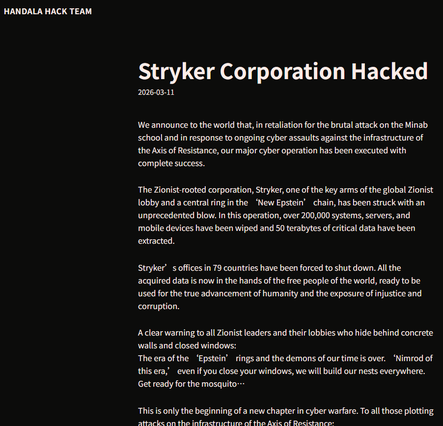 黑客组织“Handala Hack Team”近日宣称,已对Stryker Corporation实施了一次大规模网络攻击。声明称,此次攻击是报复对米纳布学校的袭击及针对“抵抗轴心”基础设施的网络攻击。攻击导致超过20万台设备数据被清除、50TB关键数据被提取,该公司在79个国家的办事处也被迫关闭。组织警告称已开启网络战新篇章,并将曝光不公与腐败。
