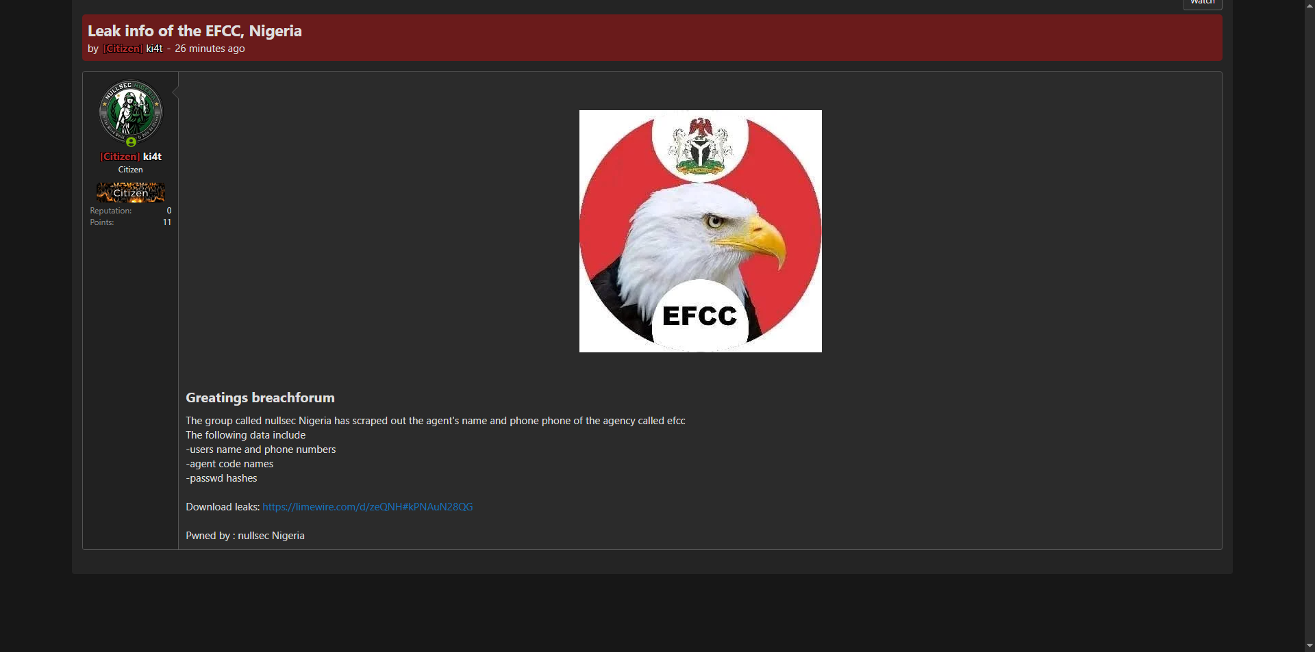 黑客论坛发布尼日利亚经济与金融犯罪委员会(EFCC)机构数据,由nullsec Nigeria团队抓取,包含大量用户姓名、电话号码、特工代号以及密码哈希。