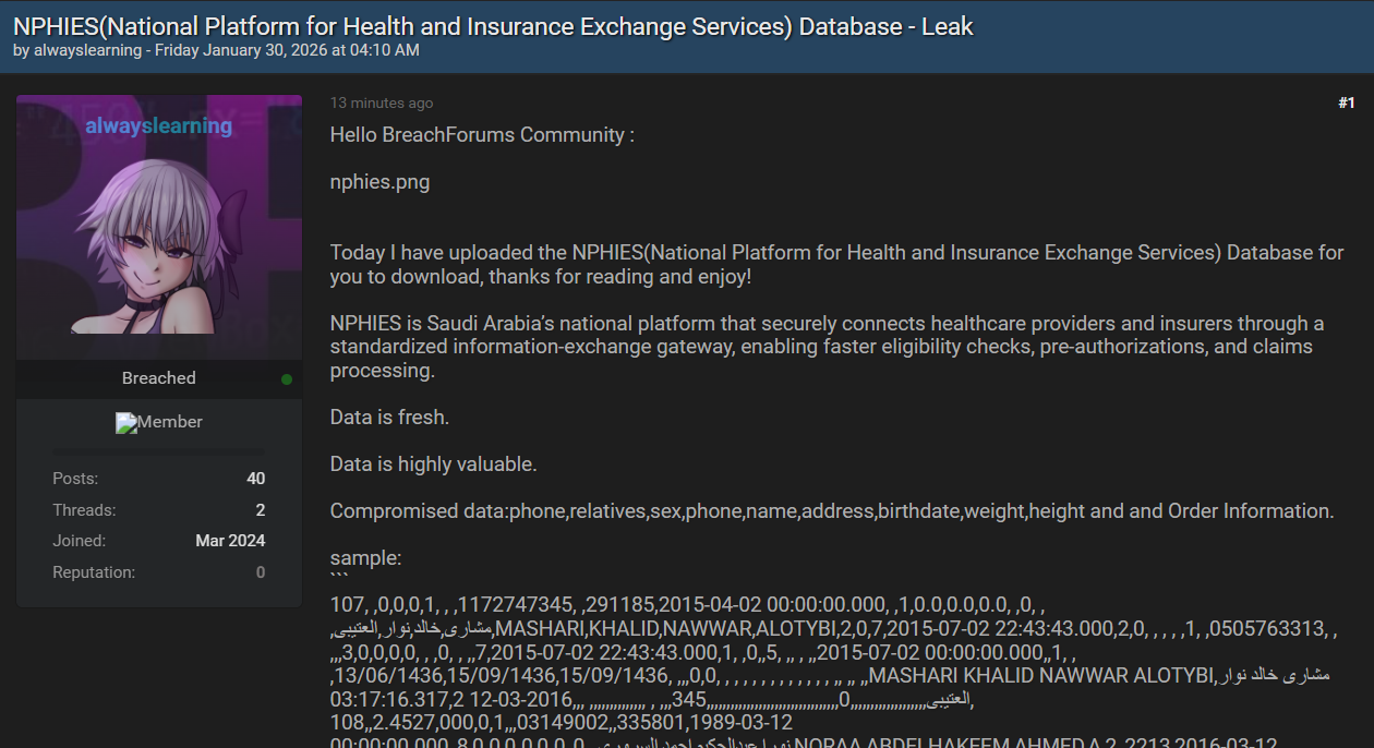 沙特阿拉伯健康与保险交换服务国家平台(NPHIES)据称发生数据泄露。该平台是沙特医疗服务机构与保险公司的全国性对接枢纽,承担资格核验、事前审批、理赔处理等核心服务,此次遭到匿名主体攻击,其数据库已被泄露至某知名网络犯罪论坛。