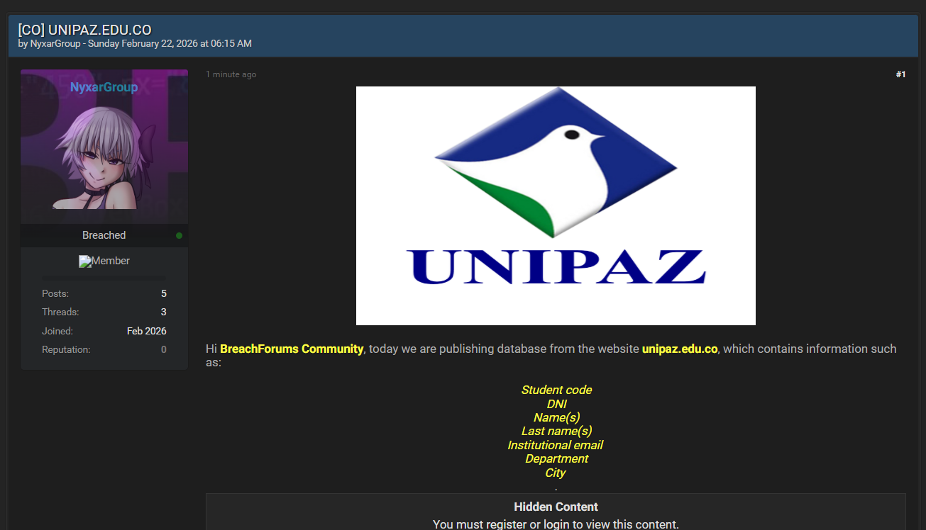 威胁行为者公开宣称,已泄露哥伦比亚UNIPAZ大学(哥伦比亚本土高校,推测以高等教育、专业人才培养为核心职能,涵盖多学科教学与基础科研业务)的核心数据集,此次泄露属于高校针对性数据泄露事件,对该大学的运营安全、学生隐私保护、教学秩序及教育领域数据合规管理构成严重威胁。
