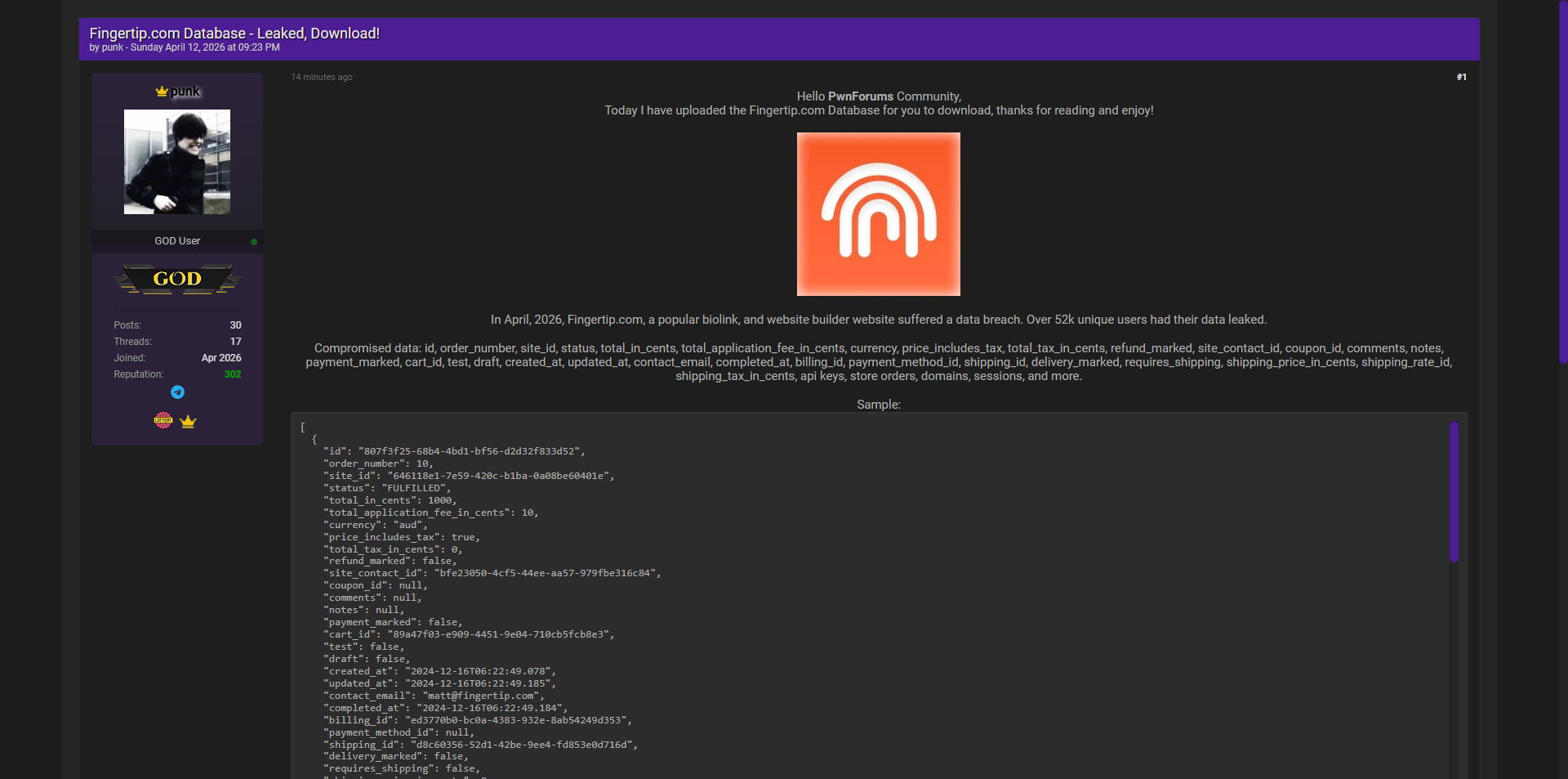 黑客论坛曝光澳大利亚知名生物链接与网站构建平台Fingertip.com完整数据库,泄露超过5.2万独立用户数据,包含大量订单记录、支付信息、API密钥及个人联系方式等敏感信息。