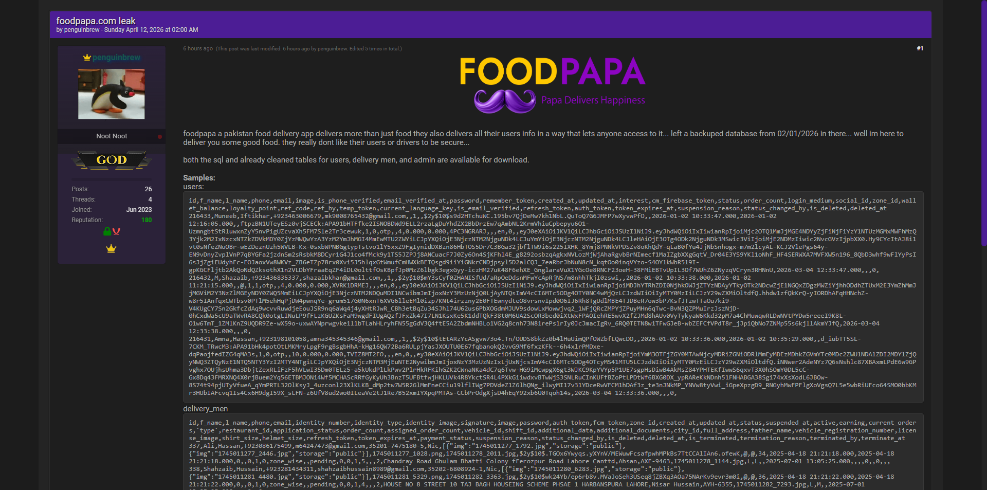 黑客论坛曝光巴基斯坦知名食品配送应用Foodpapa.com完整数据库,泄露大量用户和配送员个人信息及订单记录,包含姓名、电话、邮箱、密码、身份证明、地址、认证令牌、FCM推送令牌等多项敏感数据,数据来自2026年2月1日备份。