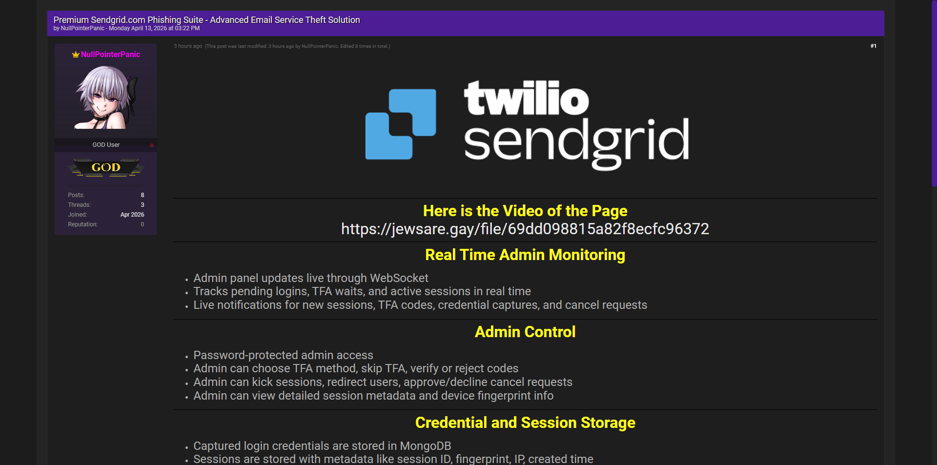 黑客论坛出售针对Twilio SendGrid邮件服务的高级钓鱼套件,该工具可实时窃取SendGrid账户凭证、实现完整邮件服务劫持,并提供管理员级实时监控与控制功能。