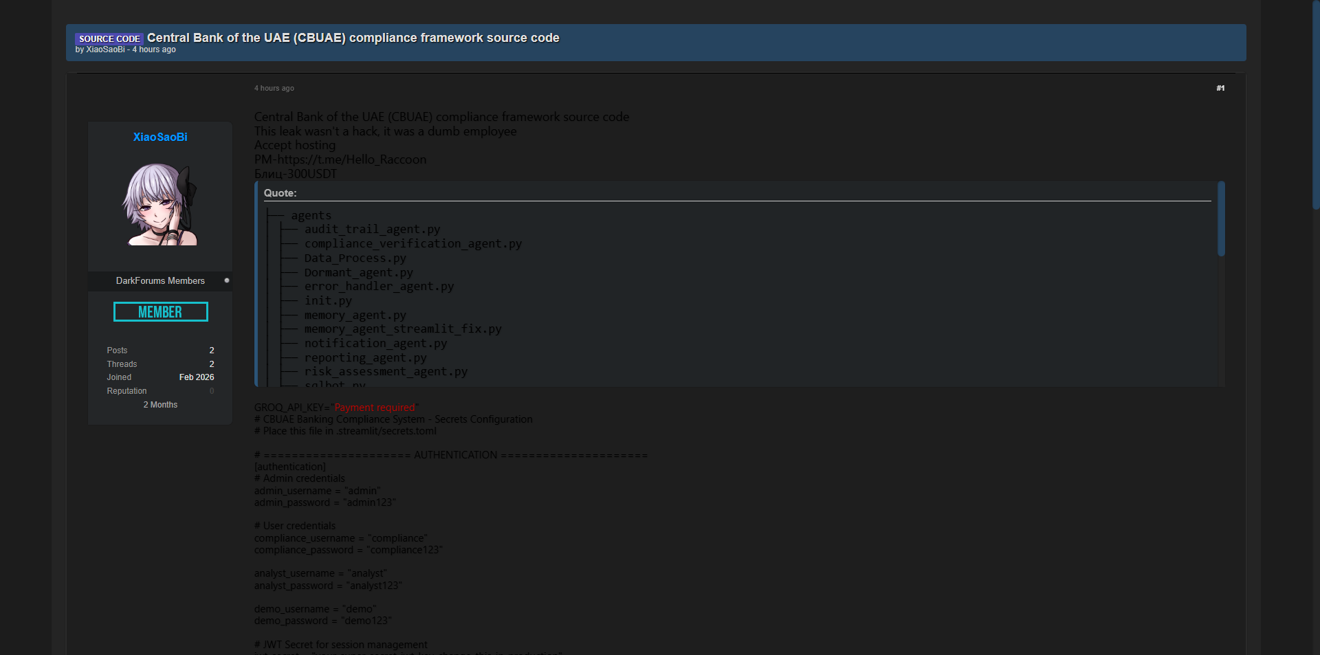 黑客论坛出售阿联酋中央银行(CBUAE)合规管理系统完整源代码,据称由内部员工泄露而非外部入侵,包含多个合规审计AI代理脚本、数据处理工具及系统配置信息。