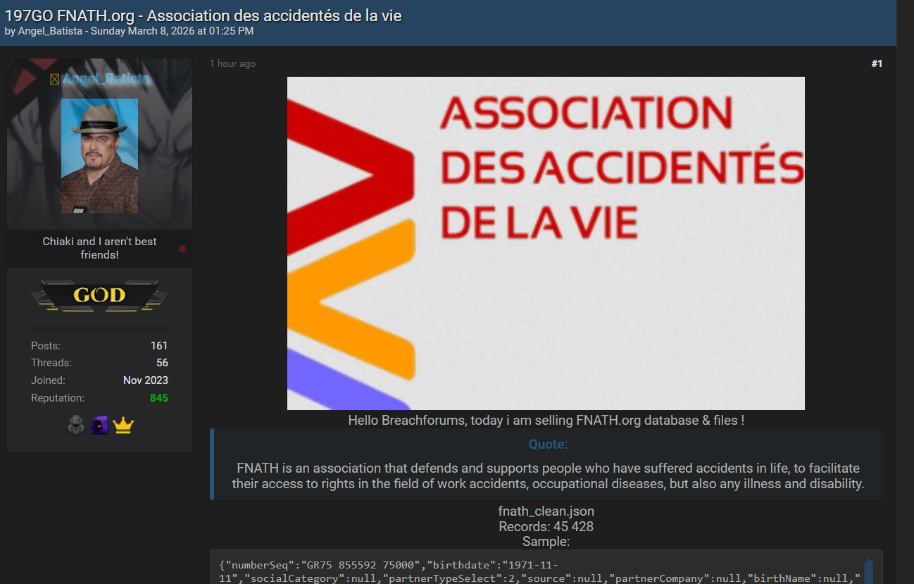 法国国家生活事故受害者联合会(FNATH - Fédération Nationale des Accidentés du Travail et des Handicapés)官网fnath.org发生数据泄露。该协会致力于维护和支持遭受工伤、职业病、残疾或其他生活事故的人员,帮助他们获取工作事故、职业病、疾病与残疾领域的权利与援助。