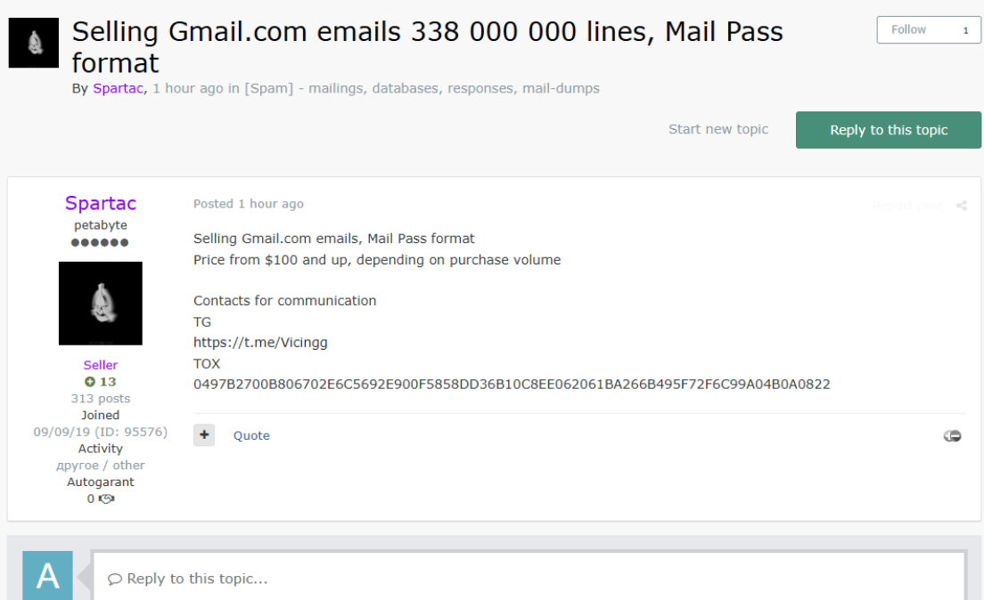 黑客论坛上出现一则帖子,一名威胁行为者公开兜售所谓“Gmail.com emails”数据集,声称包含3.38亿条(338,000,000 lines)邮件-密码组合,采用经典的“Mail:Pass”格式(邮箱:密码)。威胁行为者表示数据以批量方式出售,起售价100美元起,根据购买量议价。