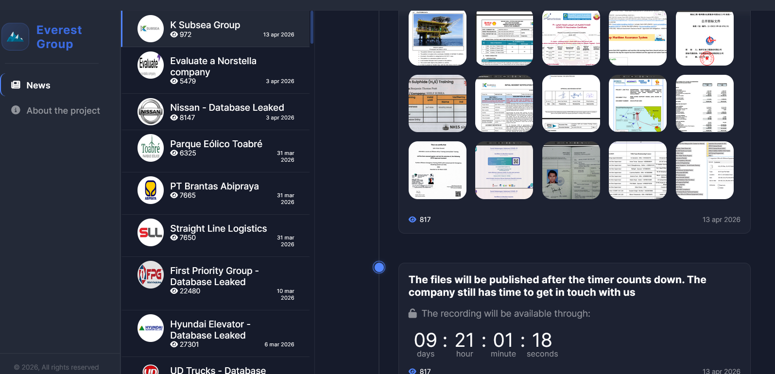 黑客论坛曝光新加坡K Subsea Group公司完整运营数据库,总计293.44GB、142,370个文件,包含公司总部全部技术档案、投标历史及船员HR数据。