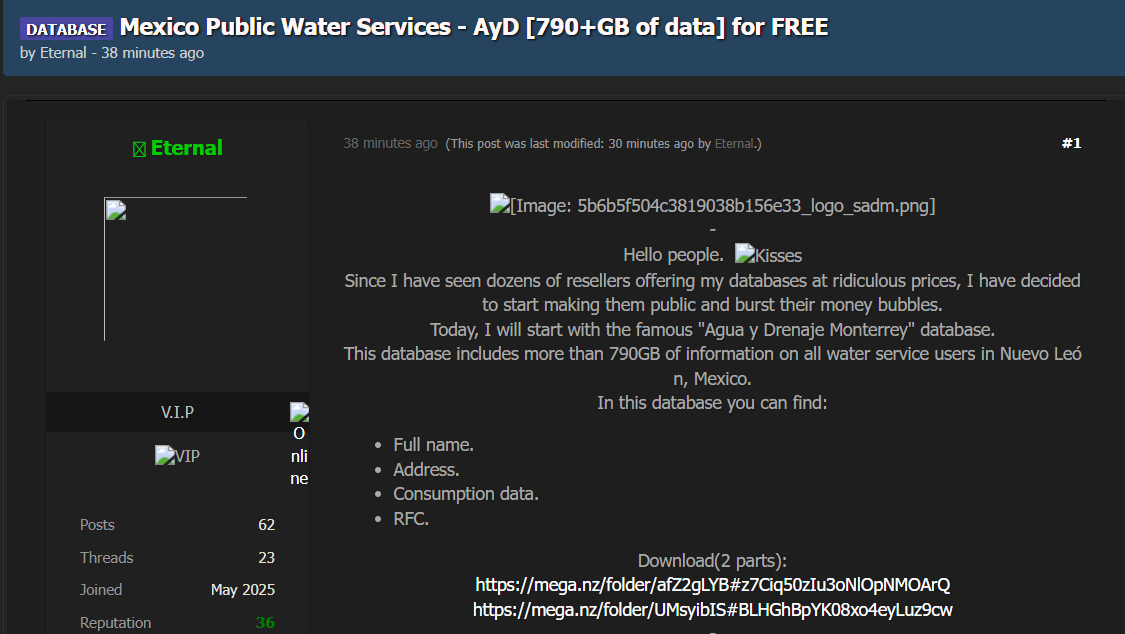 威胁行为者在黑客论坛发布消息,宣称已入侵墨西哥新莱昂州(Nuevo León)公共供水服务机构“Aguas y Drenaje de Monterrey”,泄露数据高度敏感,包括供水用户的完整个人信息及用水行为记录,极易被用于身份盗用、精准诈骗、敲诈勒索、针对性钓鱼,甚至社会工程攻击。供水服务数据因与家庭地址、实际居住人口、缴费习惯高度关联,具有极高的商业与犯罪价值。