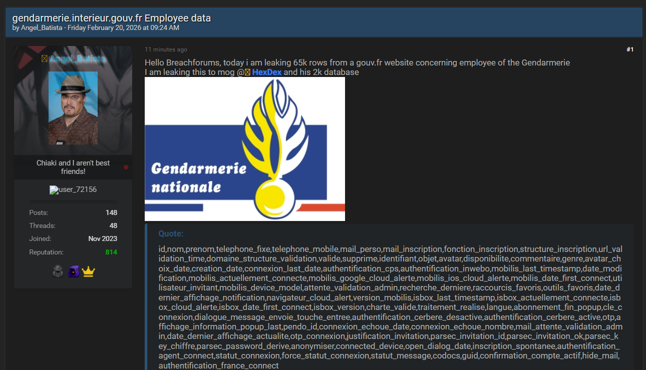 威胁行为者在暗网及黑客社群宣称并泄露法国国家宪兵队(Gendarmerie Nationale) 共计 65,000 条员工核心数据记录。法国宪兵队隶属于法国内政部,兼具军事与执法属性,其员工数据涉及敏感岗位信息,此次泄露正值法国政府部门连续遭遇数据攻击的高发期(2025 年 12 月至今),进一步加剧了法国国家安全与执法体系的数据安全风险。