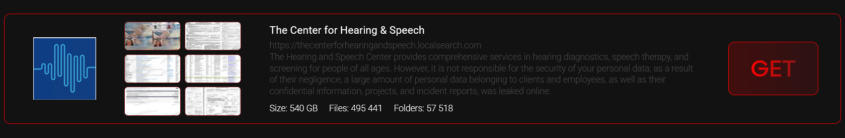 黑客论坛上曝光了美国The Center for Hearing & Speech的完整内部数据,包含客户与员工个人信息、机密文件、项目资料、事件报告、听力诊断记录、言语治疗档案以及筛查报告等高度敏感医疗和运营信息,总计540GB,包含49.5万文件和5.7万文件夹。