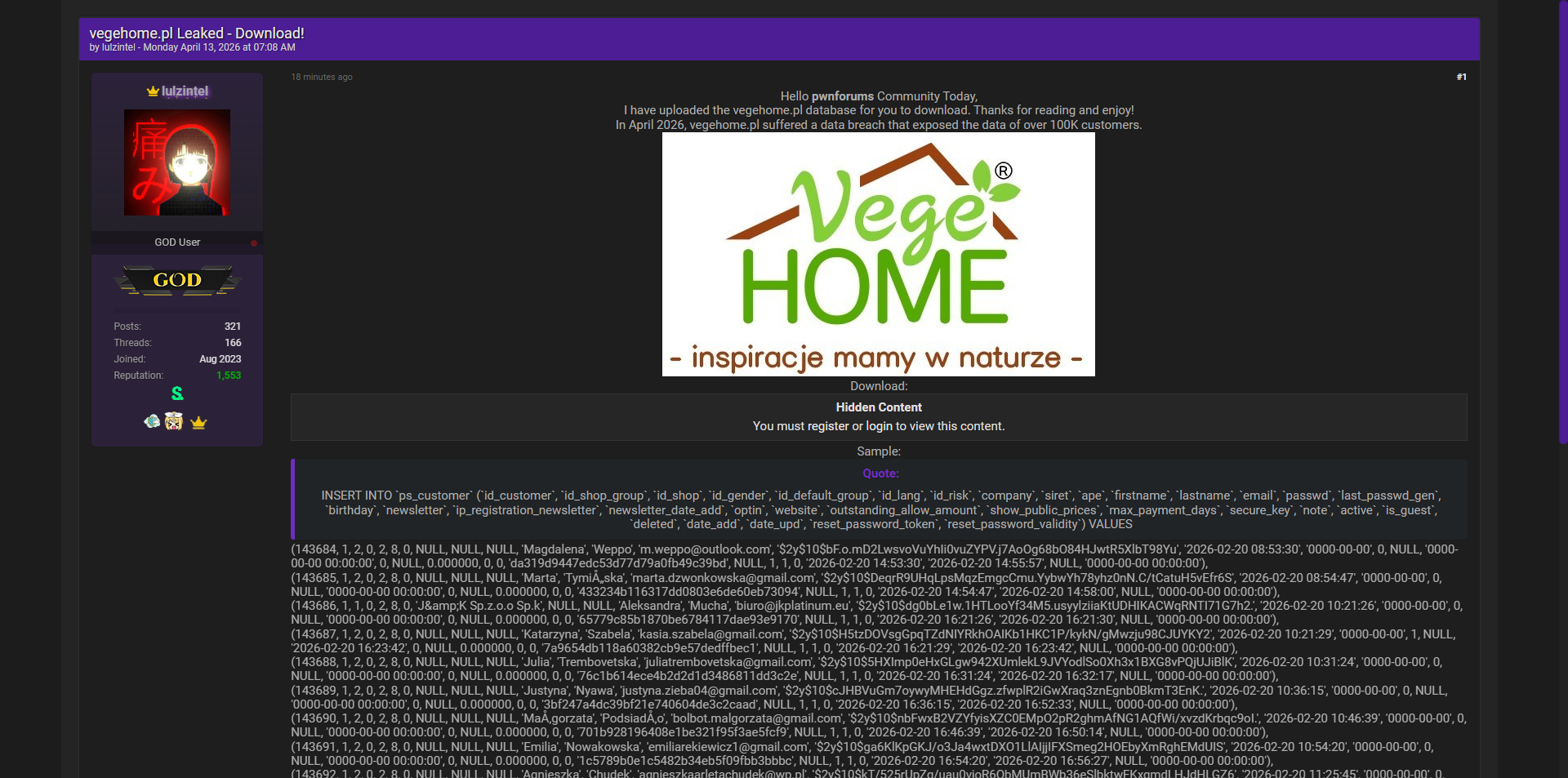 黑客论坛曝光波兰Vegehome.pl完整客户数据库,该平台为家居与自然生活类电商网站,本次泄露暴露超过10万名客户的核心个人信息。