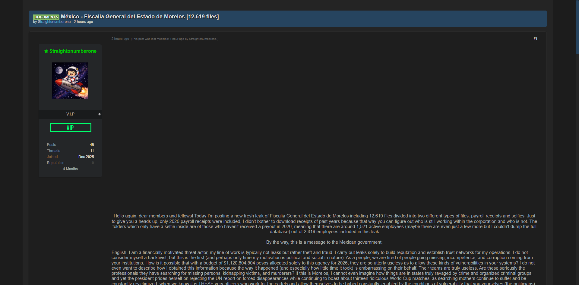黑客论坛曝光墨西哥莫雷洛斯州总检察院(Fiscalía General del Estado de Morelos)完整内部文档包,共12,619个文件,主要包含2026年员工工资单和大量员工自拍照,涉及约2,319名员工的人事与财务数据。