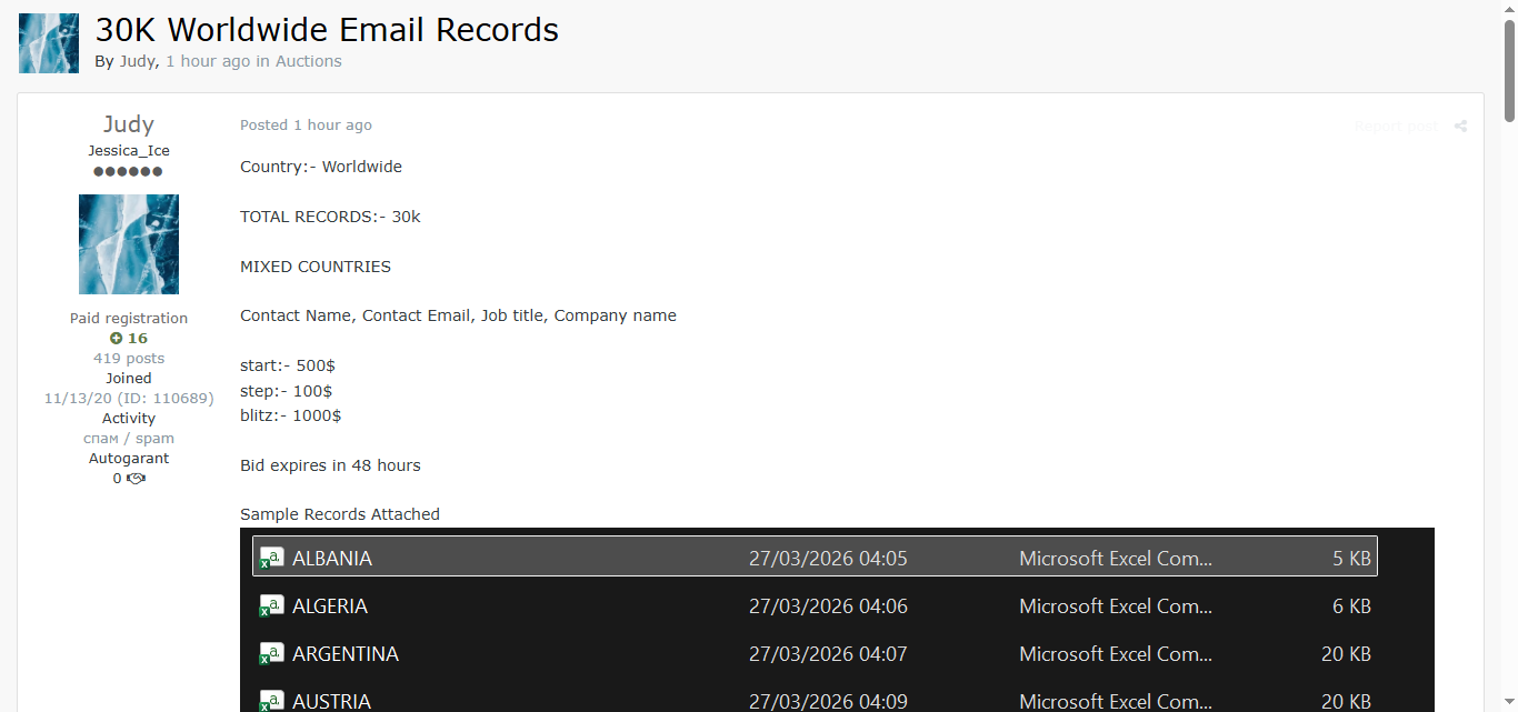 黑客论坛上拍卖一份全球商业邮箱数据库,包含3万条记录,涵盖多个国家,数据字段包括联系人姓名、邮箱地址、职位、公司名称等,可直接用于精准营销和钓鱼攻击。