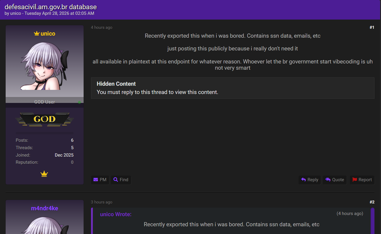 黑客论坛用户曝光巴西亚马孙州民防局(defesacivil.am.gov.br)完整数据库,泄露了大量SSN/CPF号码、邮箱地址等敏感个人信息,数据以明文形式在端点公开可访问。
