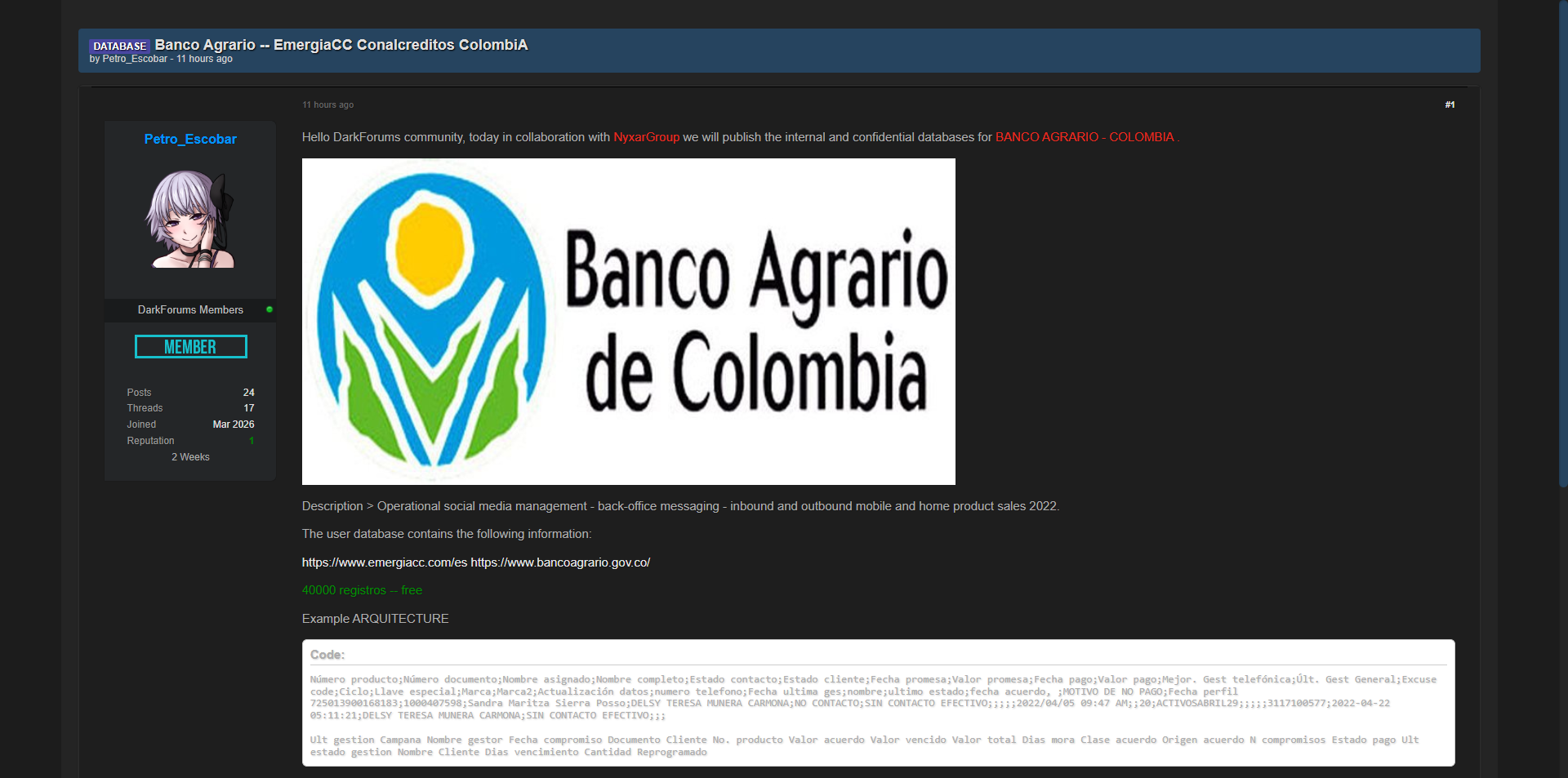 黑客论坛曝光哥伦比亚Banco Agrario银行内部数据库,包含4万条客户信贷记录,包括姓名、身份证号、电话号码、邮箱、信贷状态、承诺金额及还款记录。
