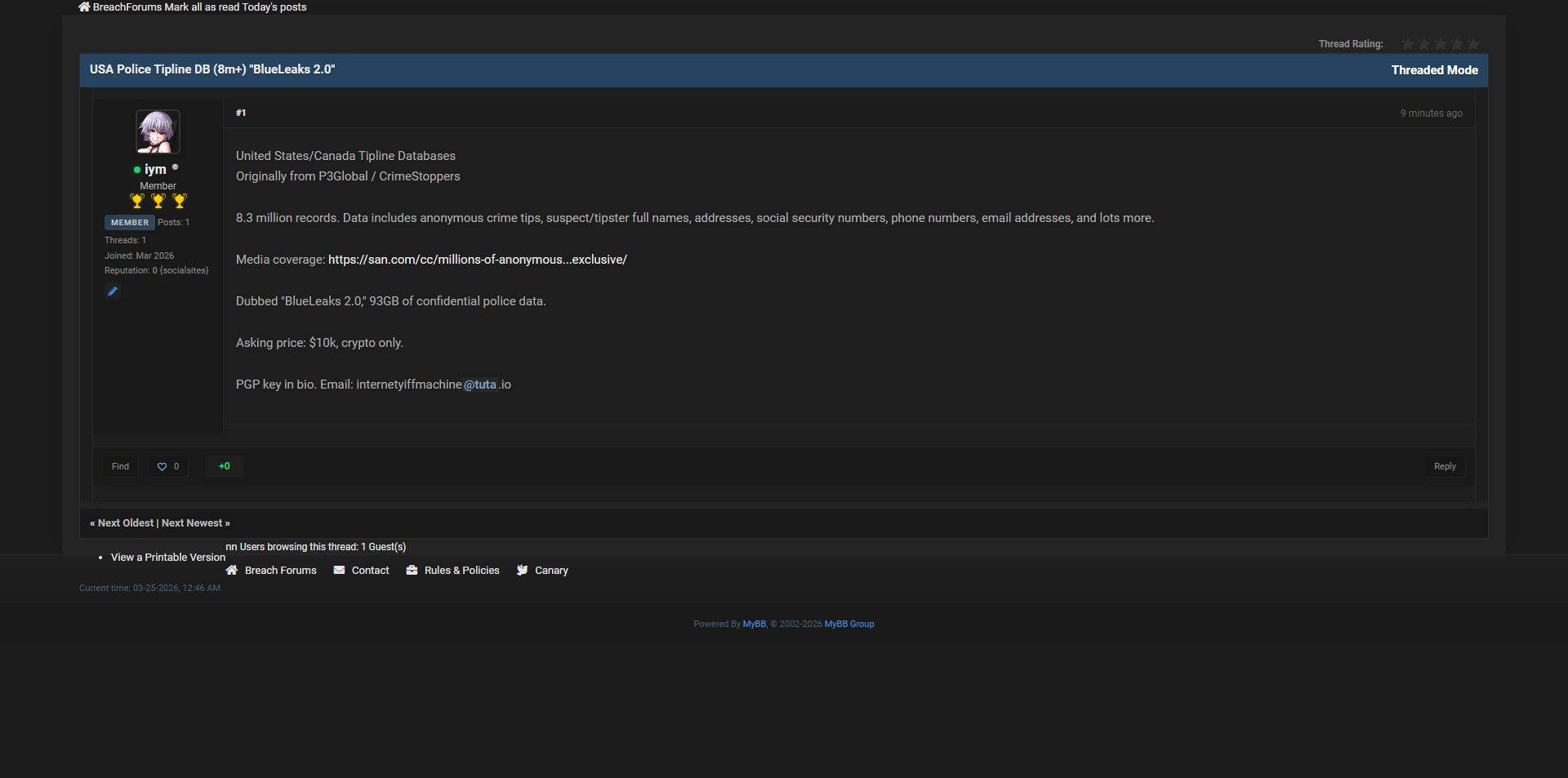 威胁行为者iym在黑客论坛宣称,已获取并公开出售美国与加拿大警方举报热线(Tipline / Crime Stoppers)数据库。该数据最初来源于P3Global / CrimeStoppers系统,共包含830万条记录(8.3 million records),总容量93GB,被称为“BlueLeaks 2.0”。